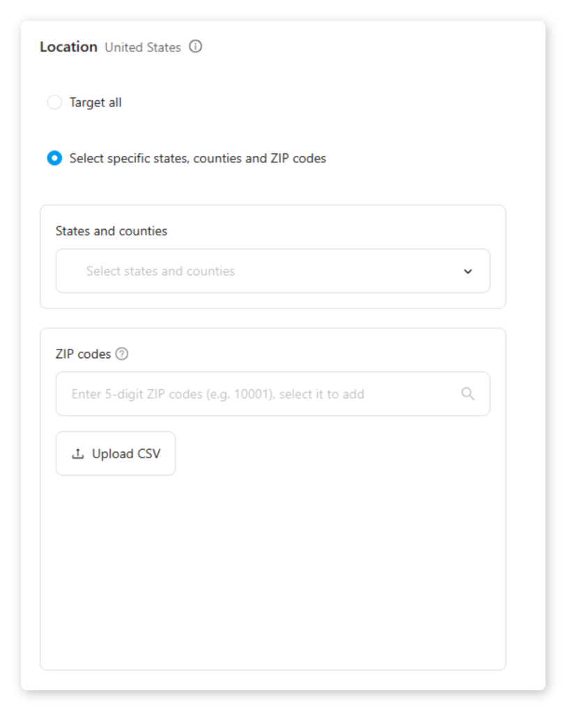 In addition to targeting specific states and counties, you can target individual ZIP codes or upload a list of ZIP codes in CSV format for easy reuse.