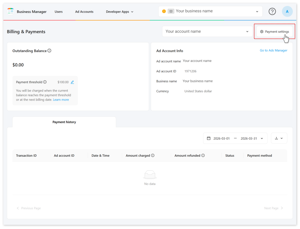 Your payment threshold is the amount that triggers automatic billing. When your ad spending reaches this threshold, we bill your primary credit card.