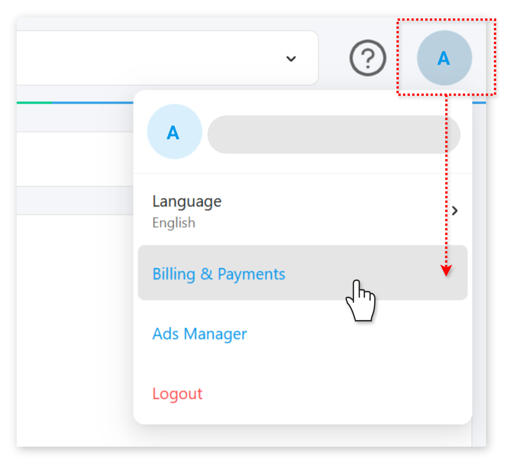 While logged in to Ads Manager or Business Manager as an admin, select the top-right user menu marked with your initial letter and mouse down to Billing & Payments.