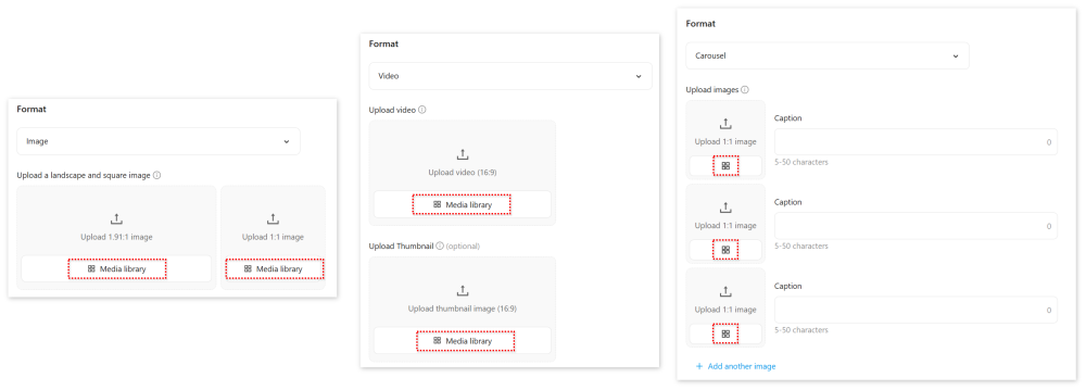 When creating a new ad in Ads Manager, you can access previously uploaded image or video files by clicking [Media library] as shown below for various ad formats.