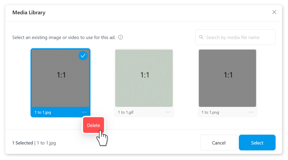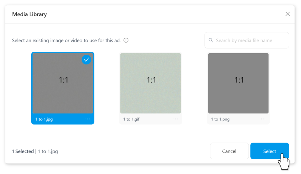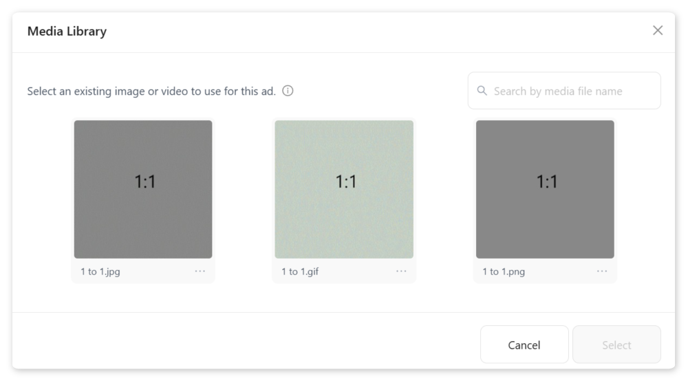 The media library pop-up will appear, showing all media files that can be used for your selected creative type: images, video, or carousel cards.