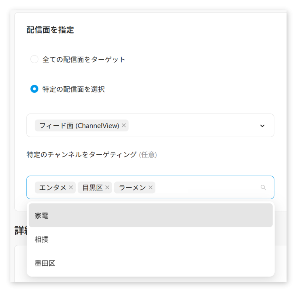 4[特定のチャンネルをターゲティング(任意)]で、ドロップダウンメニューを押下してリストを展開するか、直接入力して結果を絞り込み、リストに追加します。