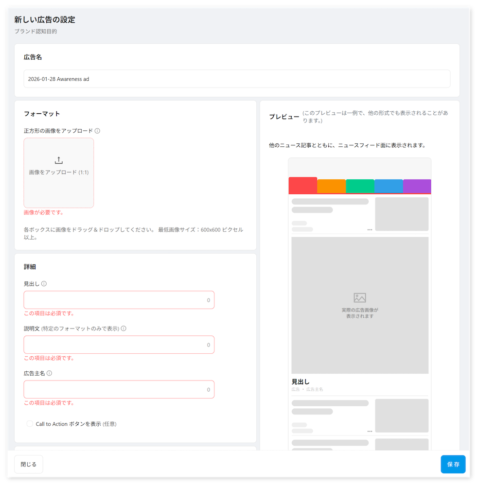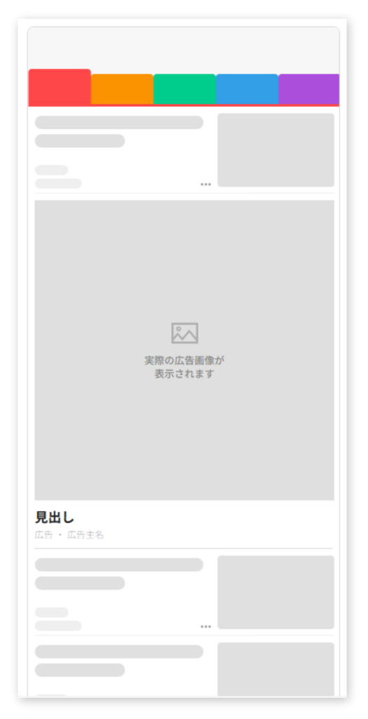 | クリエイティブサイズ | 600×600pixel以上の画像 (300×300pixelは不可) |