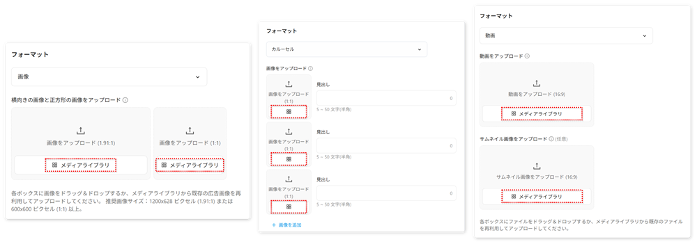 広告マネージャーで新しい広告を作成する際、以下のように各広告フォーマットで[メディアライブラリ]を選択することで、以前にアップロードした画像または動画ファイルにアクセスできます。