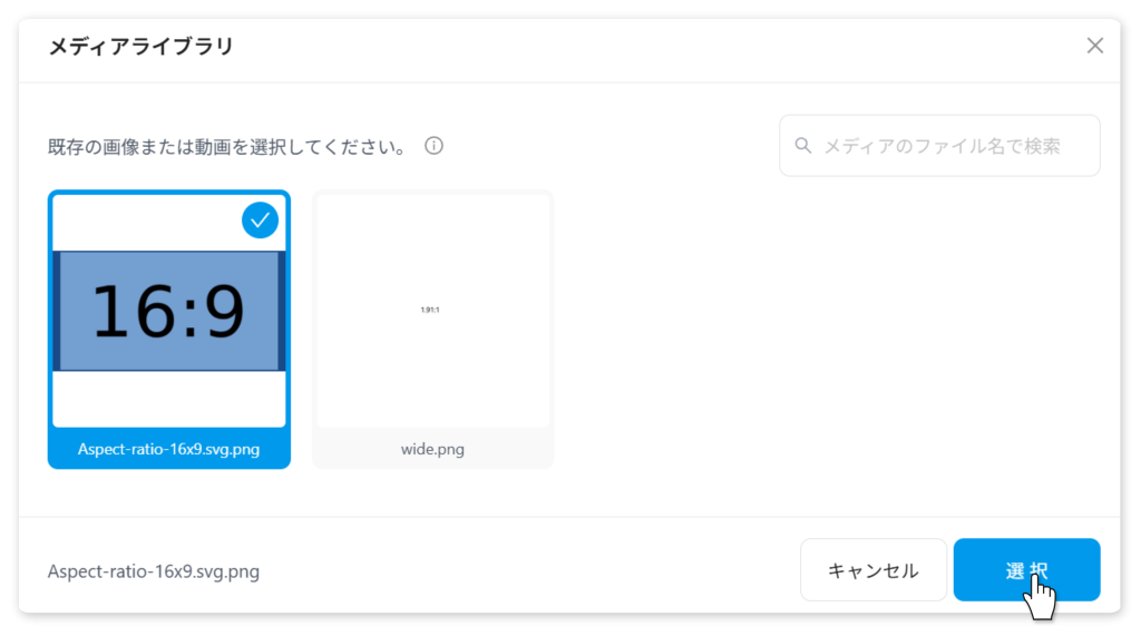 使用したいメディアファイルを選択し、[選択]を押下します。