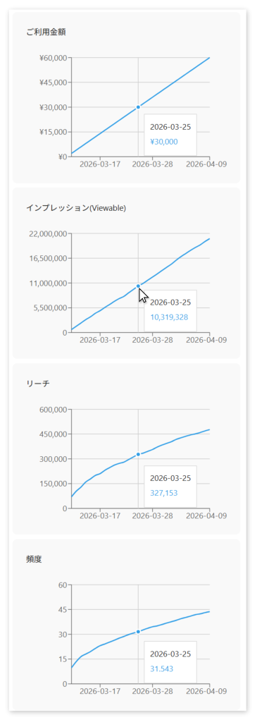 キャンペーンプランナーでは、配信開始から30日間のご利用金額・インプレッション(Viewable)・リーチ・頻度(フリークエンシー)のグラフを確認できます。