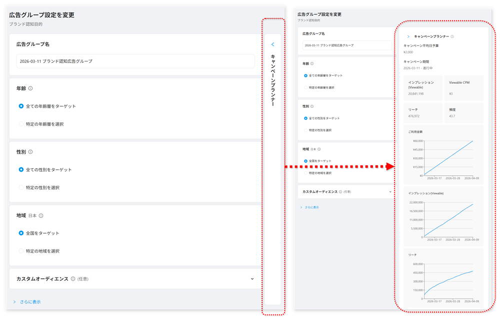 「ブランド認知」目的のキャンペーンを運用する際、広告グループの設定画面右側から「キャンペーンプランナー」を活用いただけます。