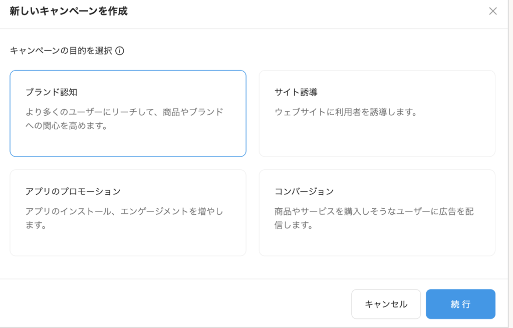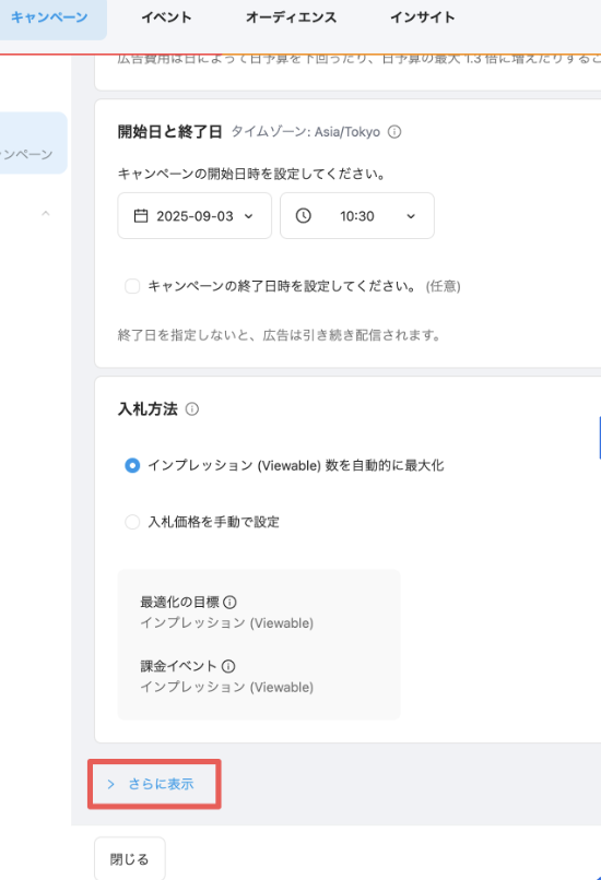 1 新しいキャンペーンを作成し、目的として「ブランド認知」を選択します。キャンペーン設定画面の最下部にある[さらに表示]を押下してください。