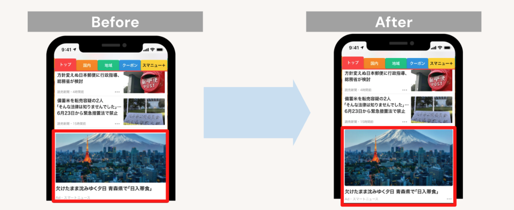 - 従来の広告フォーマットでは、動画の視認領域が限られており、広告が他のコンテンツに埋もれやすい課題がありました。今回のアップデートにより、Large UnitはSmartNews App上でより大きく表示されるようになり、視認性が大幅に向上 します。