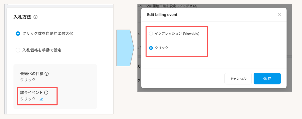 これにより、キャンペーン作成時に「クリック課金」・「インプレッション(Viewable)課金」のどちらかをお選びいただけるようになります。