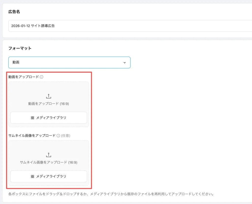 A:現在、メディアライブラリに表示されるのは、広告クリエイティブとしてすでにアップロードされたファイルのみです。ライブラリへの直接アップロードは現時点ではできません。