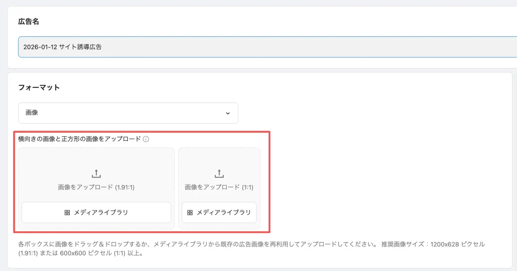 - 本機能のリリース後、広告作成画面の画像・動画アップロード部分に「メディアライブラリ」アイコンが表示されるようになります。